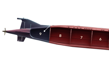 The turbo-generator supplying the sub with electric energy and the equipment that powers the sub’s movement is located here. Underwater, the sub makes less noise than the sea itself.
